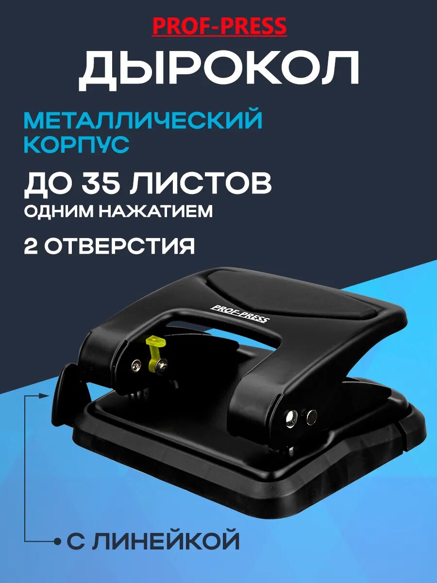 Дырокол Prof-Press, металлический корпус, до 35 листов, с линейкой, черный информация: