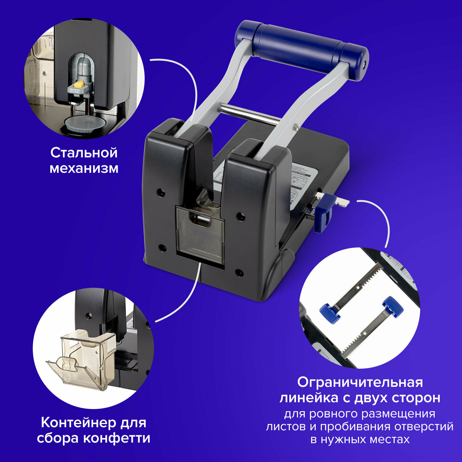 Дырокол для бумаги канцелярский с линейкой А4 мощный до 110 листов, металлический, черно-синий, Brauberg Extra Heavy Duty, 272721 информация: