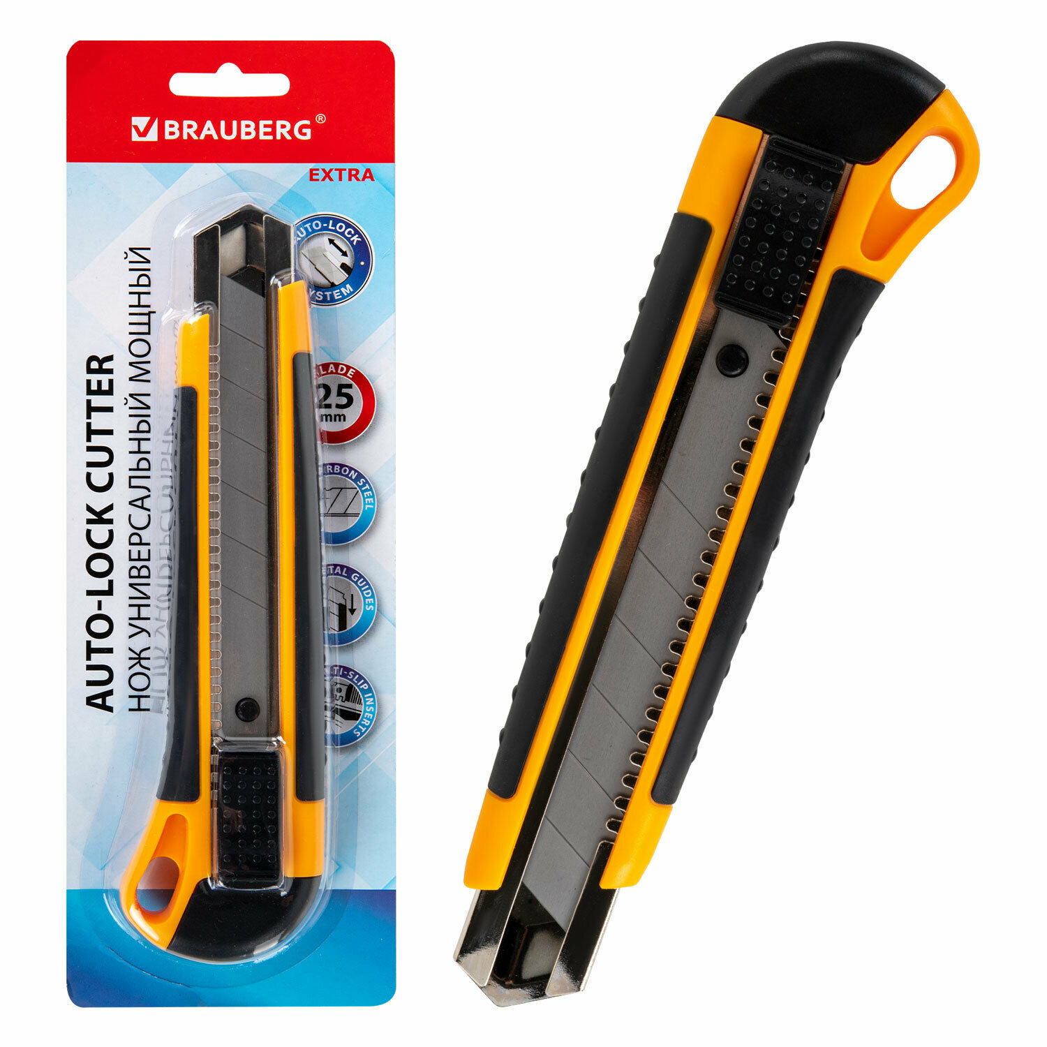 10 цен на Нож канцелярский строительный универсальный мощный, ширина лезвия 25 мм, автофиксатор, резиновые вставки, Brauberg Extra, 238731
