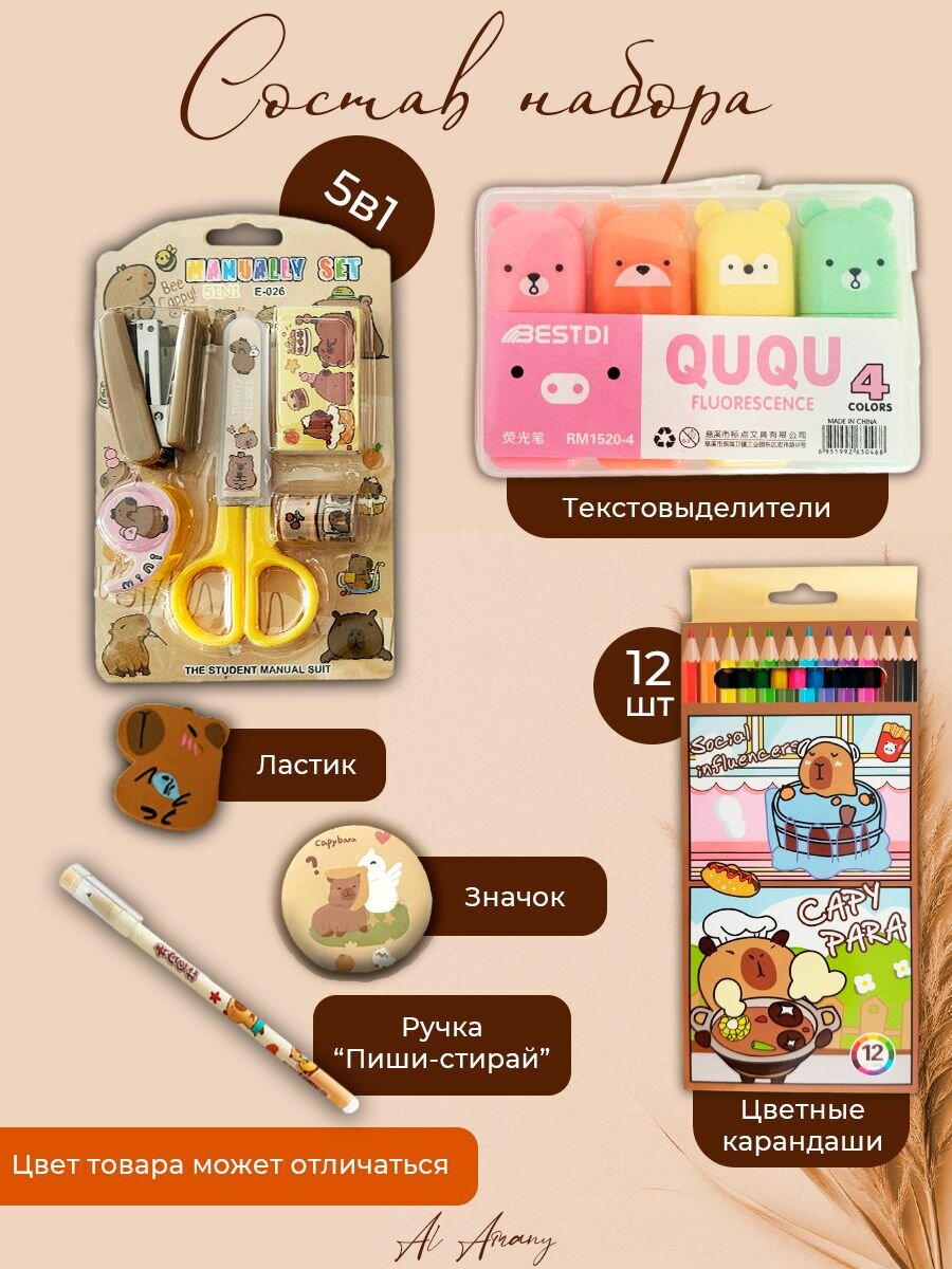 10 цен на Подарочный набор канцелярии для школы капибара 37 предметов, школьные принадлежности, подарок выпускнику и первокласснику