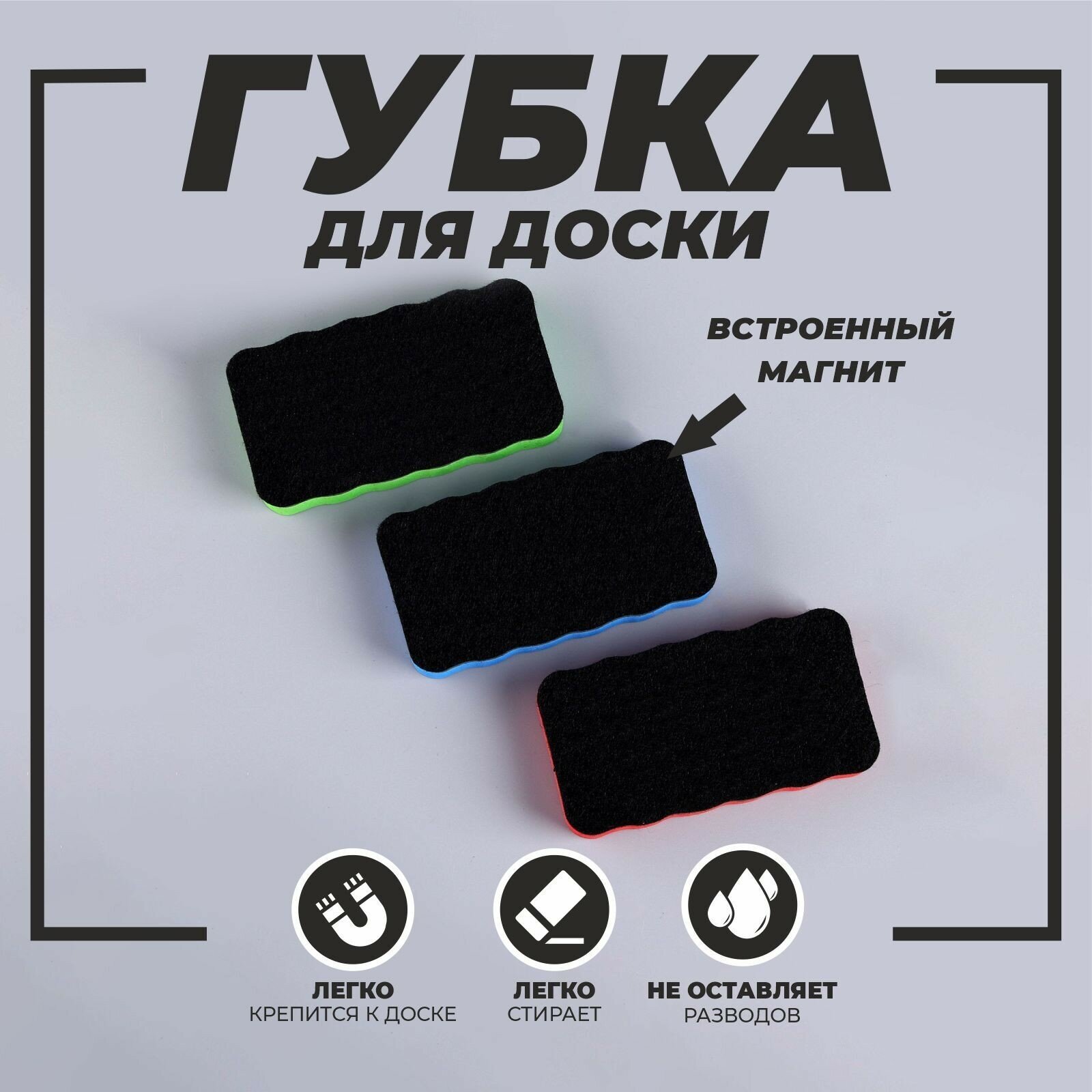 Губка для досок, магнитная, 1 шт, цвет микс, 10,5 × 5,5 см, ЛАС играс информация: