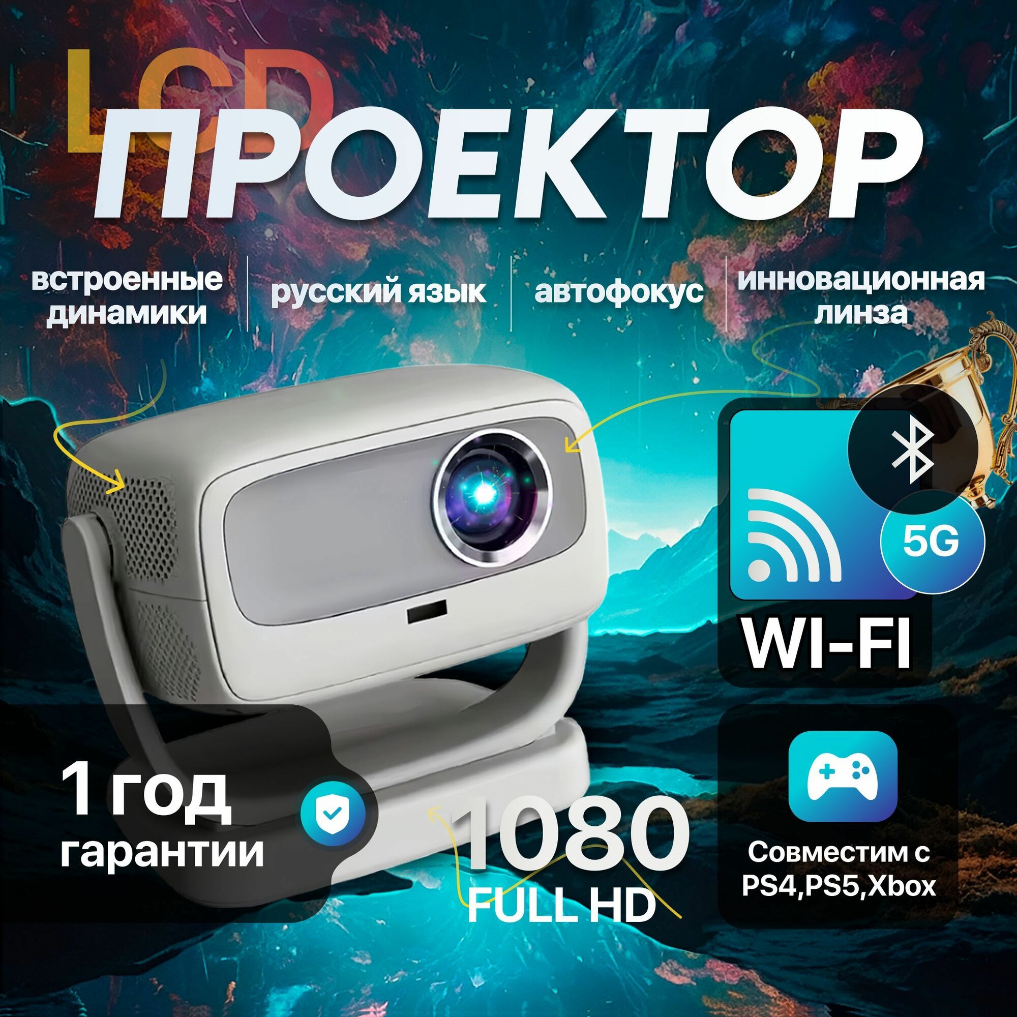 Проектор для фильмов 5G 2024, FULL HD 4К, HDMI, Wi-Fi, Bluetooth, Встроенные динамики, 1LCD, серый информация: