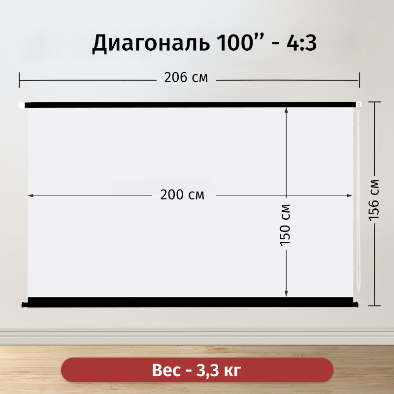 Экран для проектора Лама рулонный 200x150 см, формат 4:3, диагональ 100" информация: