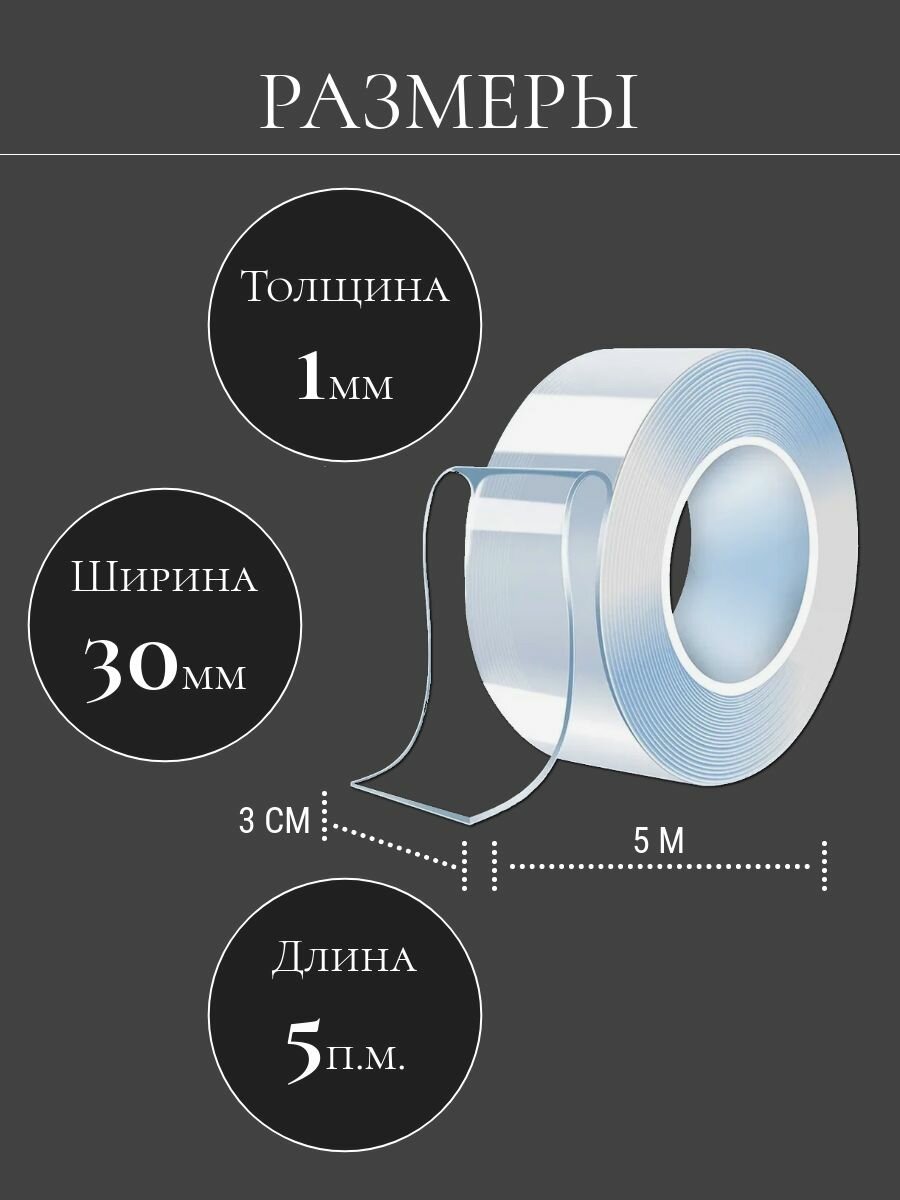 Скотч прозрачный, двухсторонний, клейкая лента прозрачная многоразовая силиконовая, нано лента, 30 мм 5 м, 1 шт. информация: