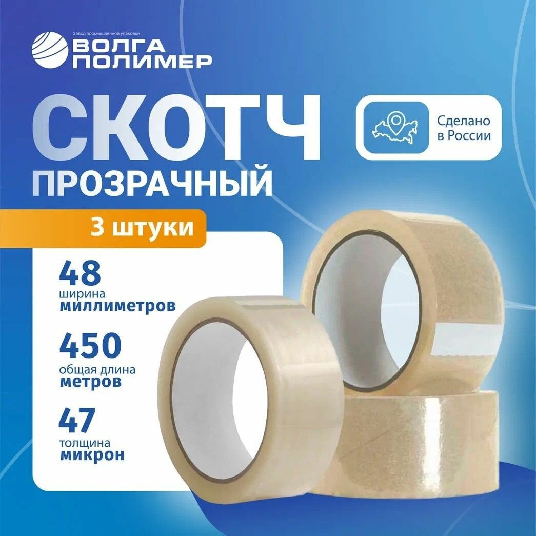 Скотч прозрачный широкий 48 мм х 150 м, 47 мкм, 3 штуки, Клейкая лента Волга Полимер информация:
