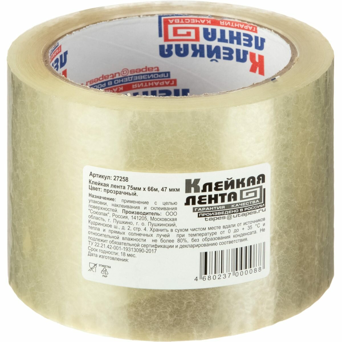 Клейкая лента (скотч) упаковочная (75мм x 66м, 47мкм, прозрачная) (27258) информация: