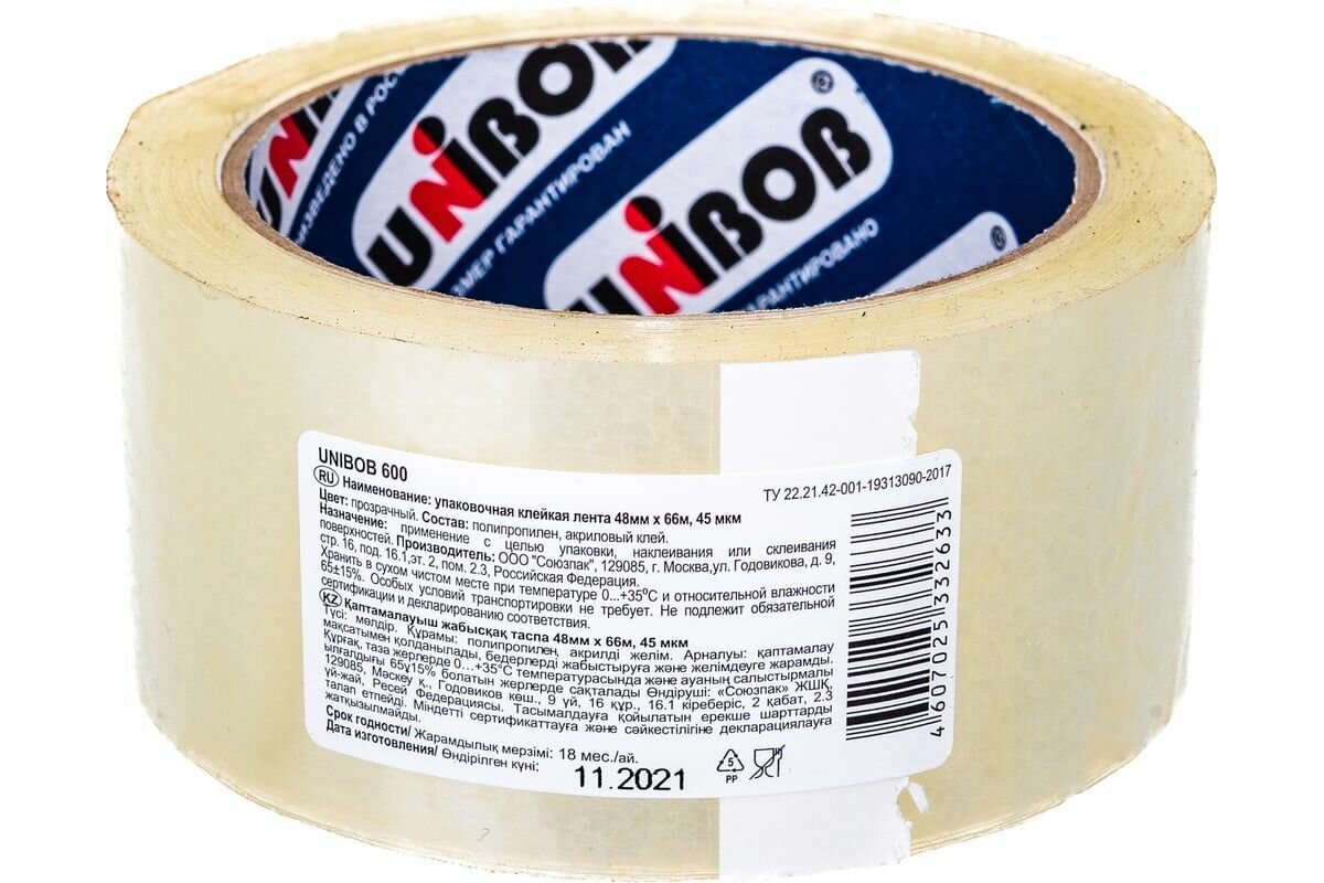 Упаковочная клейкая лента UNIBOB прозрачная 48 мм х 66 м 134838 информация:
