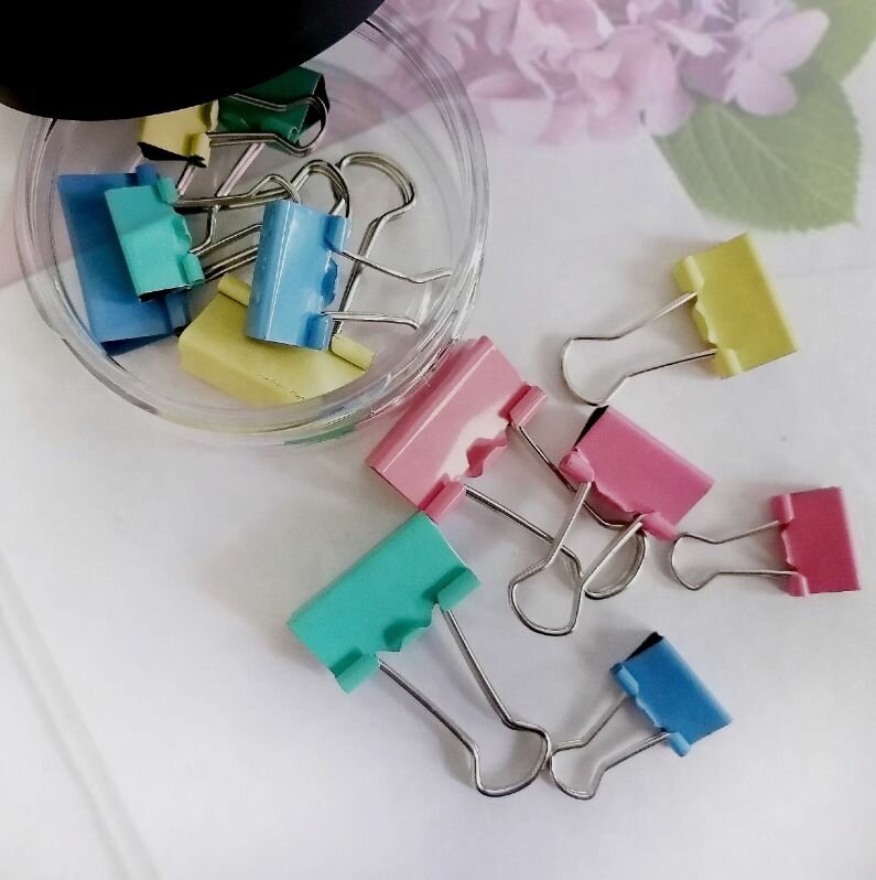 Отзывы на Зажимы для бумаг цветные. Набор 12 штук в пластиковой банке 3 размера - 15 мм, 19 мм, 25 мм, 4 пастельных цвета.