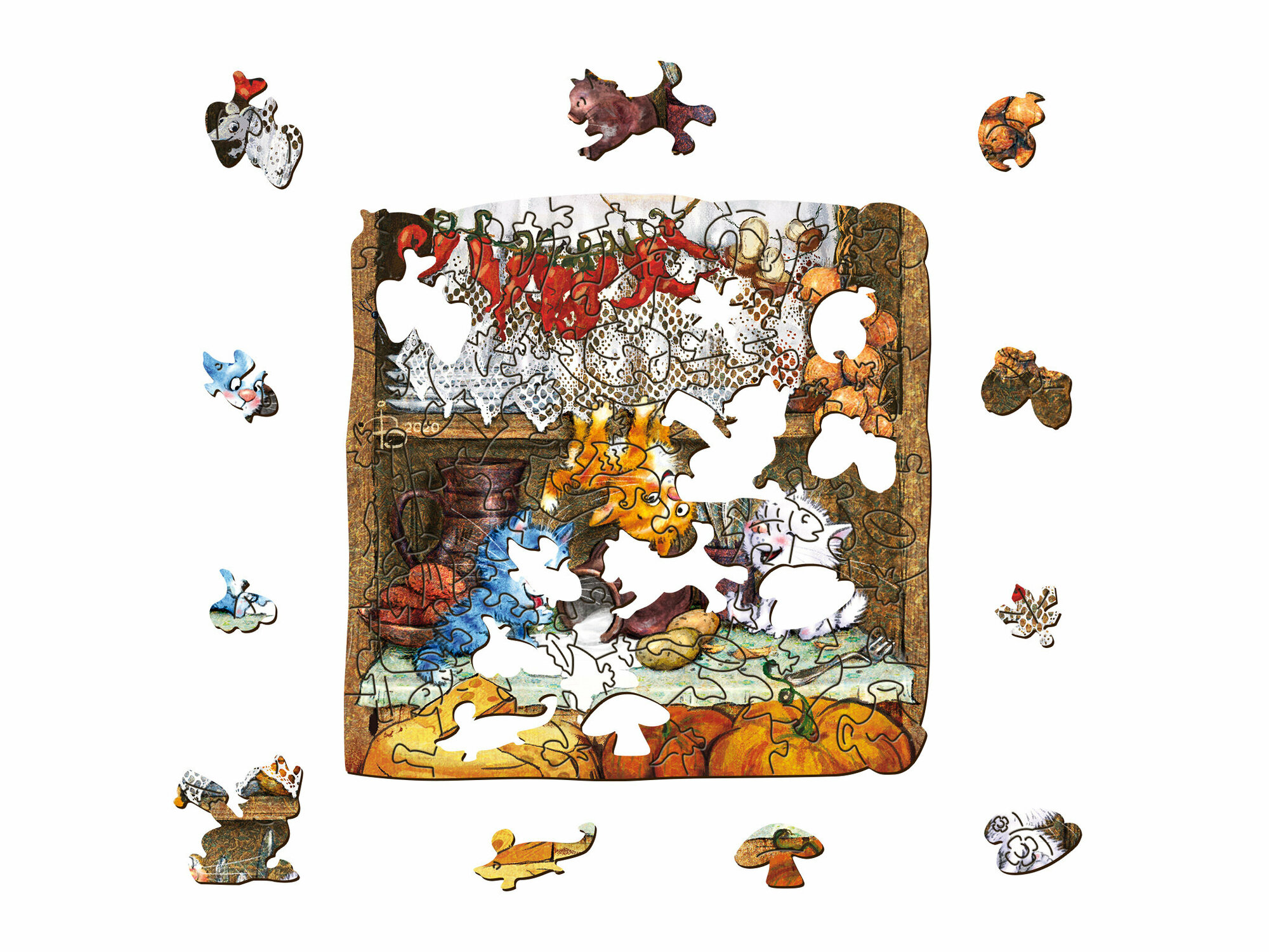 Характиристики этого товара не найдены!Отзывы на Фигурный деревянный пазл "Синие коты - Осень в Котофеевке" контурный, 64 детали