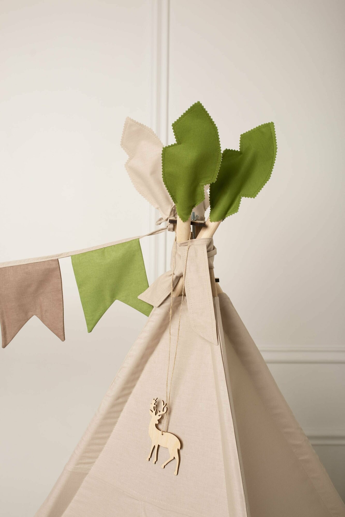 Вигвам детский с ковриком, окошком , подушкой и антискладывателем бежевый зеленый с флажками информация: