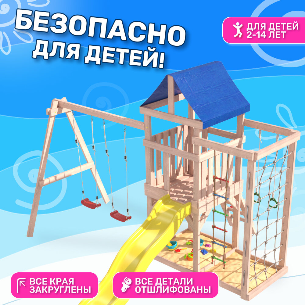 Детская игровая площадка Fun Land неокрашенная с сеткой стенкой для лазания и качелями. Игровой комплекс с горкой информация: