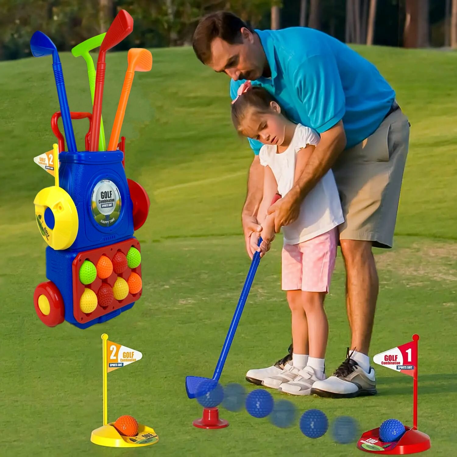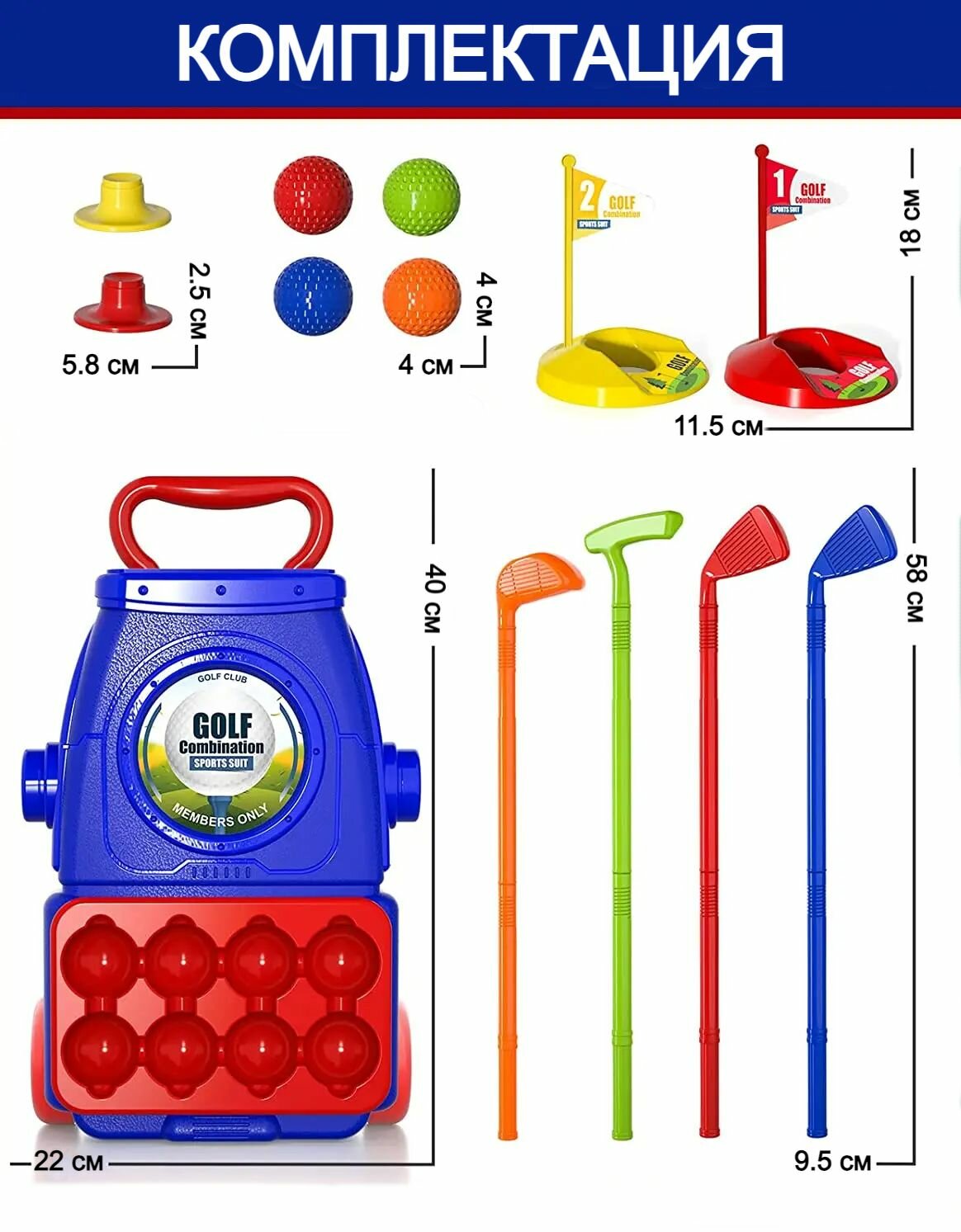 Отзывы на Детский игровой набор для гольфа Golf Tournament, тележка, 4 клюшки, 8 мячей, подставки с лункой, игра в гольф, 40х22х10 см