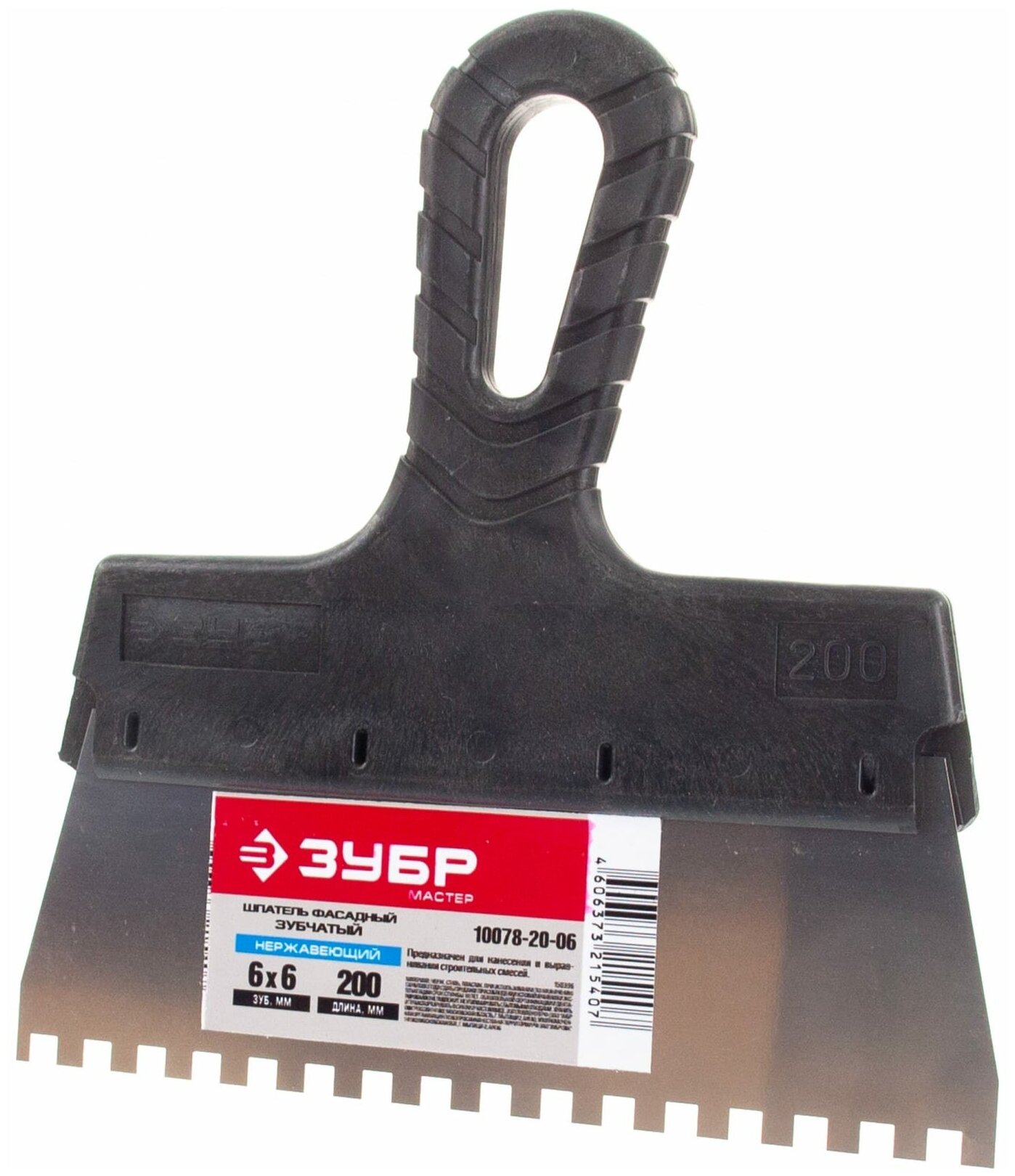 ЗУБР 200 мм, зуб 6х6 мм, зубчатый пластиковая ручка, нержавеющий, Фасадный шпатель, мастер (10078-20-06)