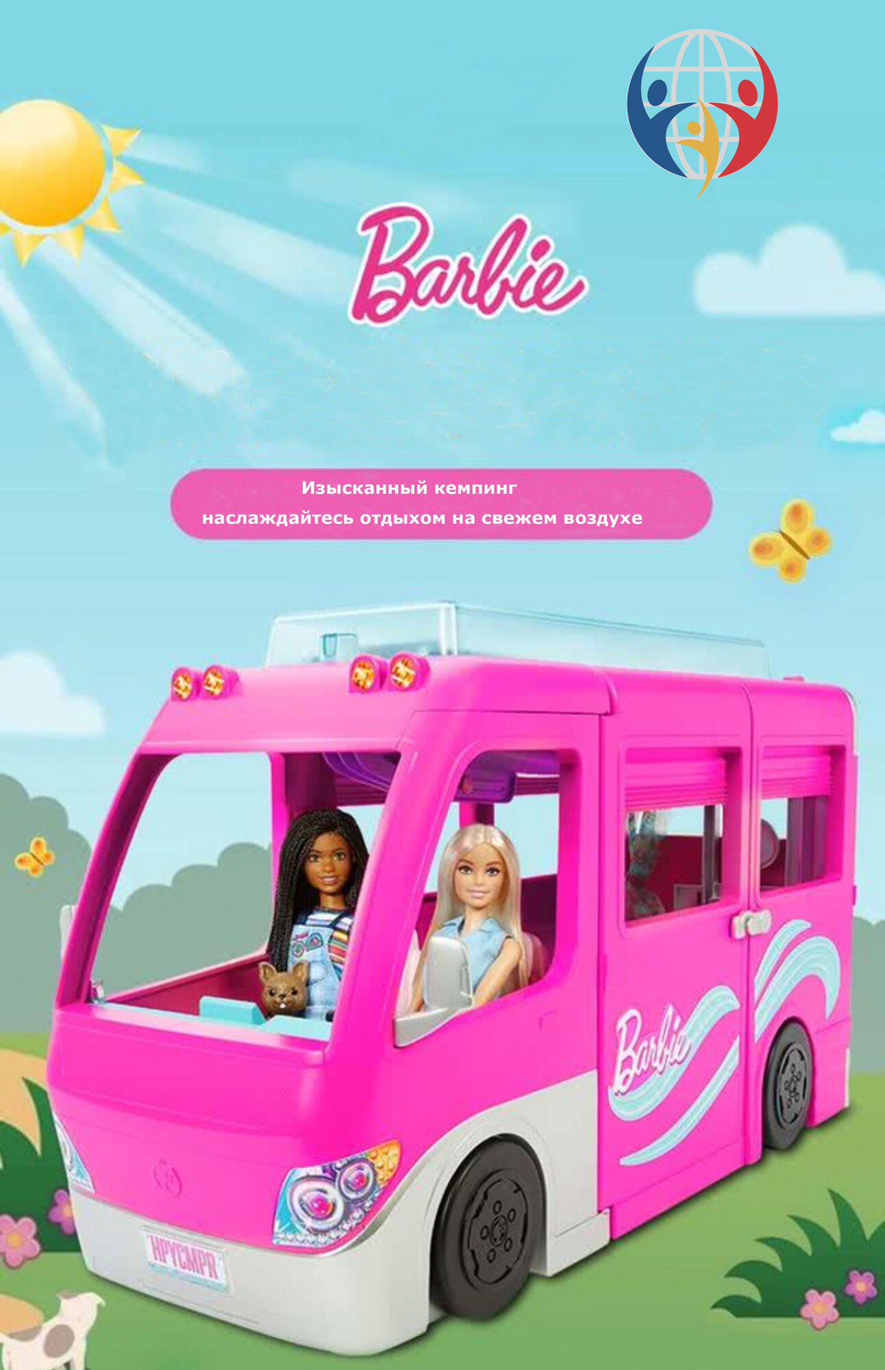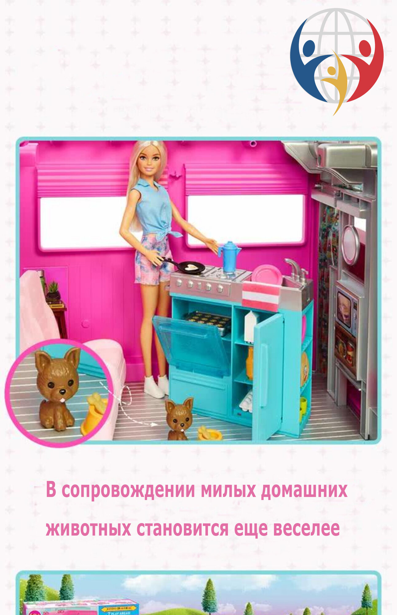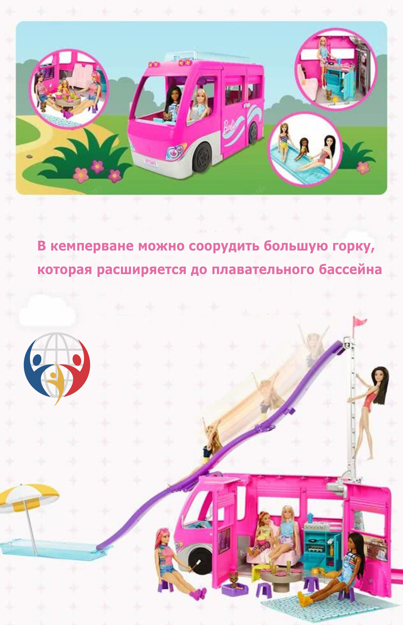 10 цен на Барби , Мобильный дом мечты ,Большая горка, большой бассейн,2 куклы Барби, 60 аксессуаров,HCD46