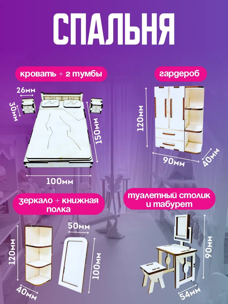 Мебель для кукольного дома ВОТ ТАК WOOD, для кукол разных типов, деревянная, набор информация: