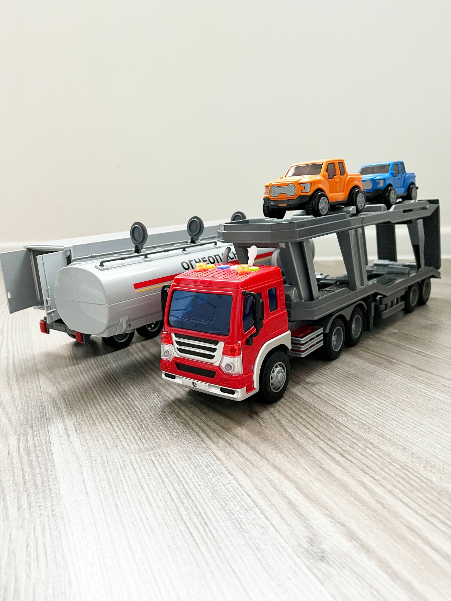 Отзывы на Набор 3 прицепа (фура, бензовоз, автовоз с 2-мя машинками) и тягач Сити (динамо-инерция, свет, 4 звука) / Полесье - красный