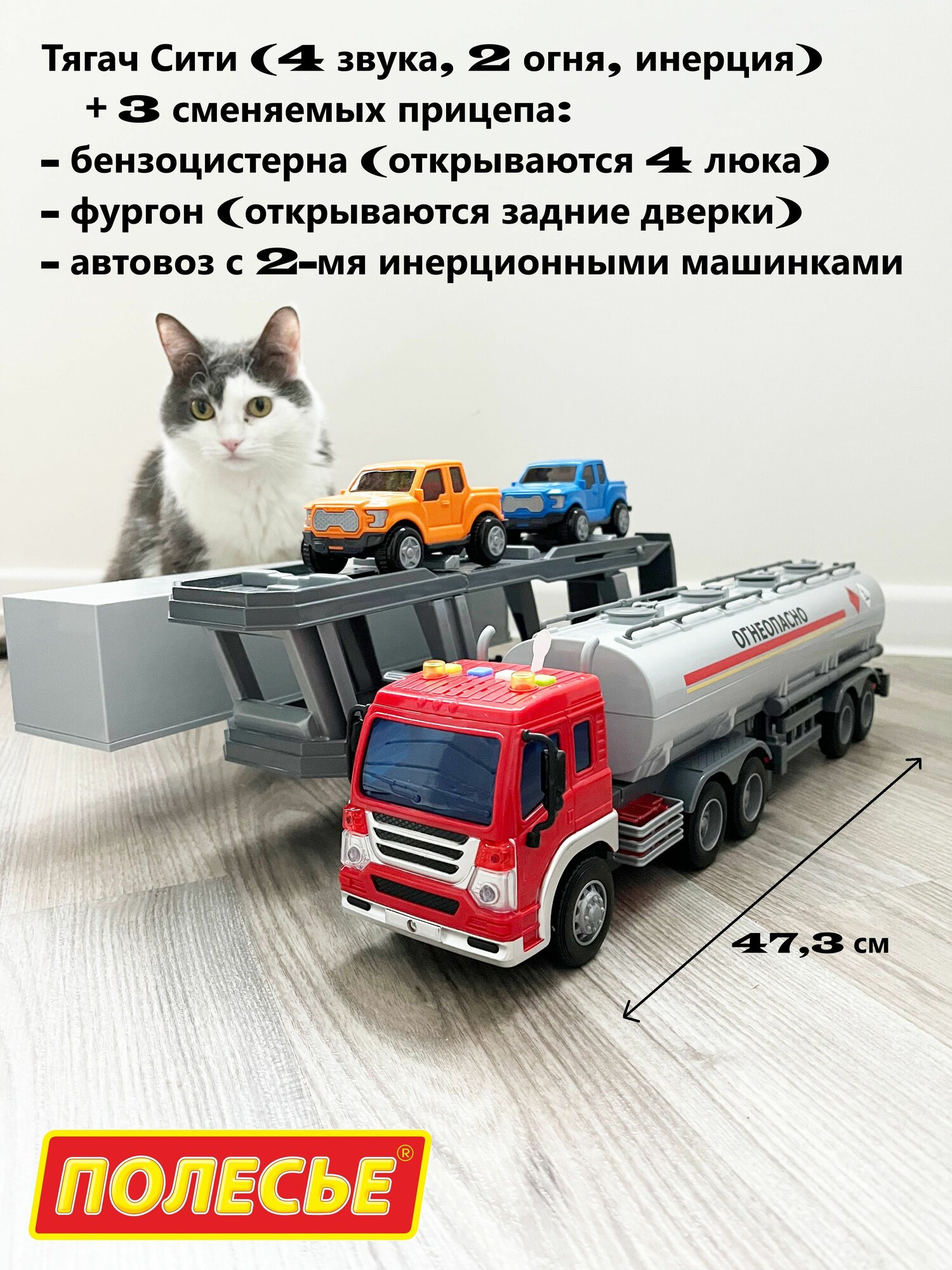 Набор 3 прицепа (фура, бензовоз, автовоз с 2-мя машинками) и тягач Сити (динамо-инерция, свет, 4 звука) / Полесье - красный информация: