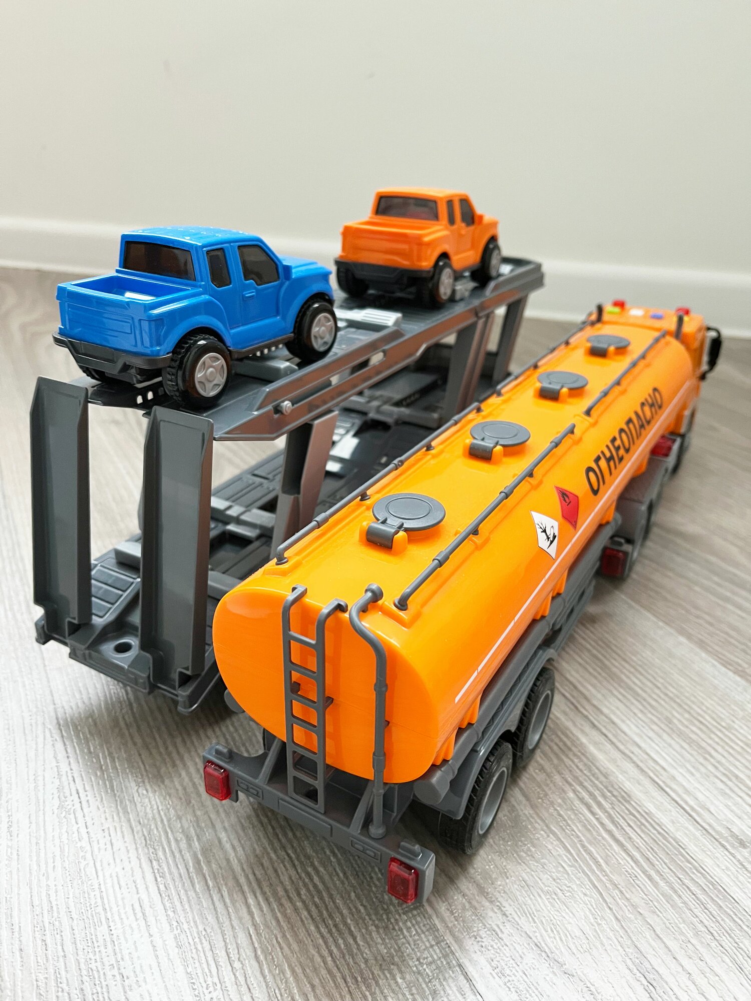 Отзывы на Набор 2 прицепа (цистерна + автовоз с 2-мя машинками) + тягач Сити (динамо-инерция, свет, 4 звука) / Полесье - оранжевый