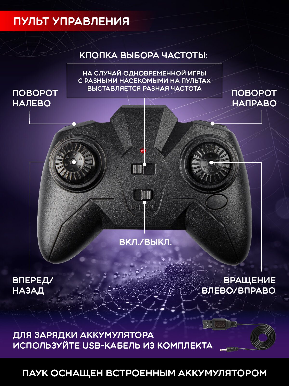 Радиоуправляемый Паук, на батарейках, пульт управления, насекомое, на пульте управления, черный, JB0405316 1 300 ₽