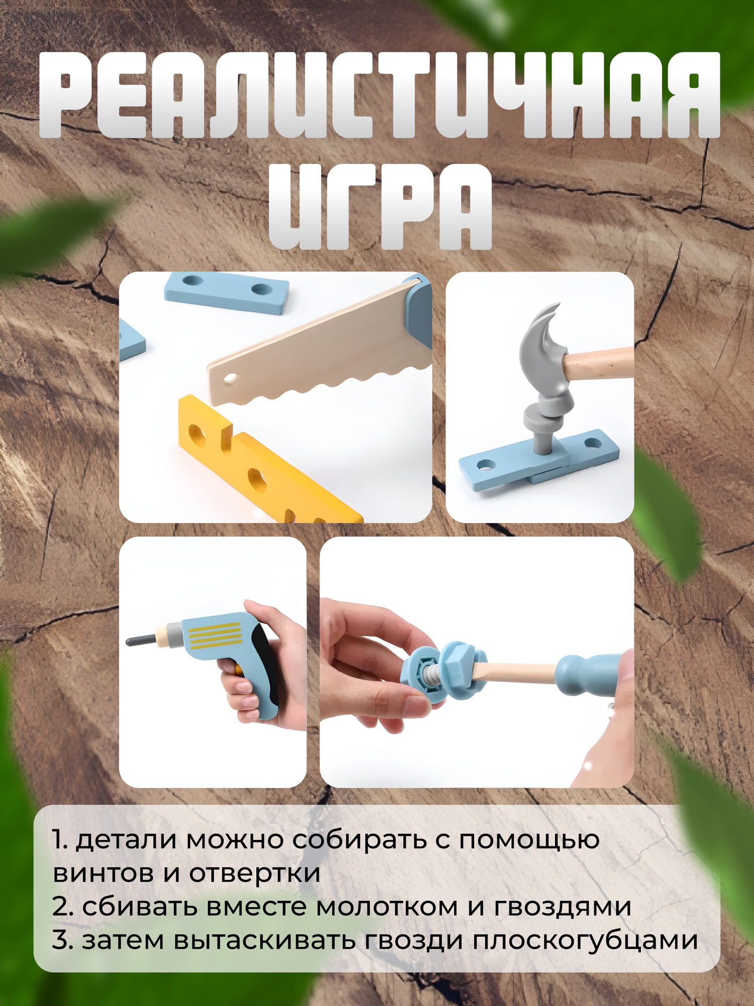 Набор инструментов для мальчика детский строительный, набор строителя в ящике, деревянный конструктор, деревянные игрушки для малышей