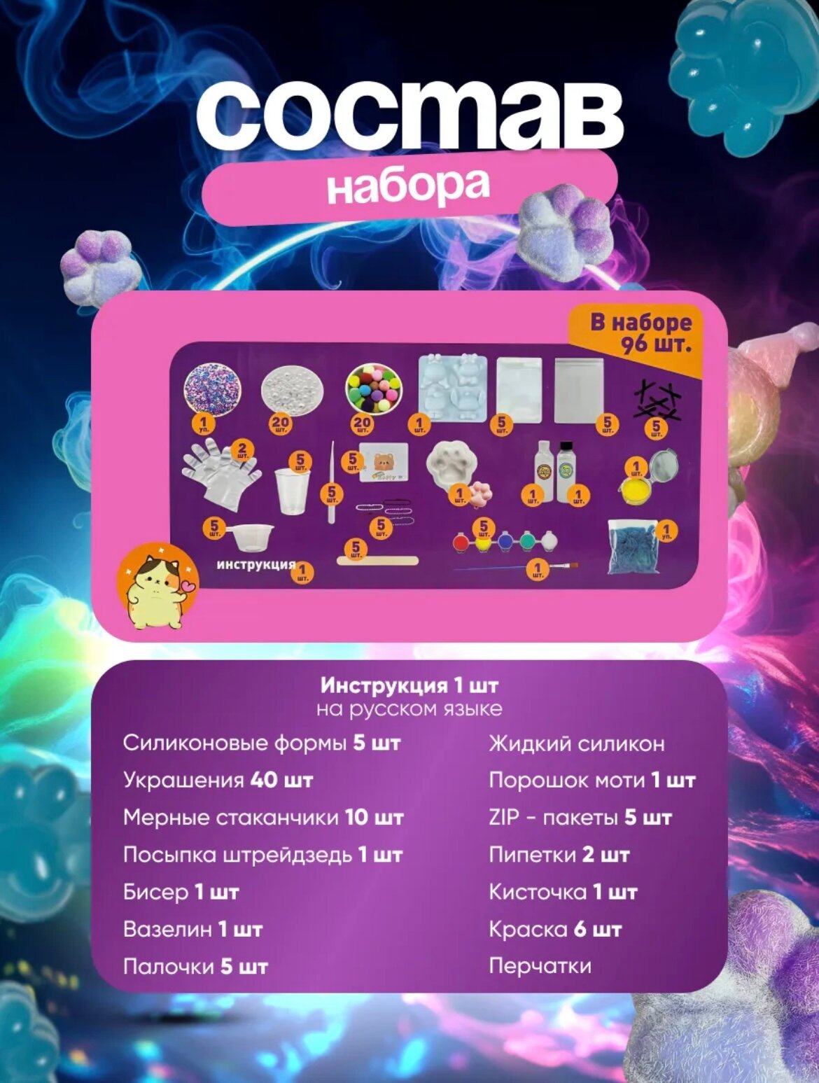 Большой набор для изготовления сквишей, набор для творчества лапка из силикона, 96 предметов информация: