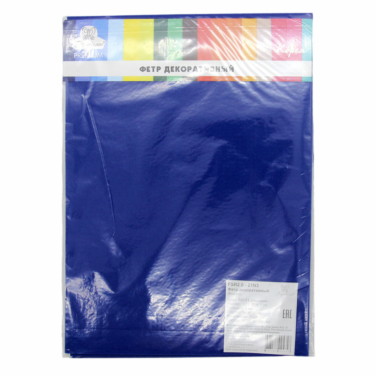 Набор декоративного фетра 22*30 см, толщина 2 мм, 3 листа в упаковке (21 электрик) информация: