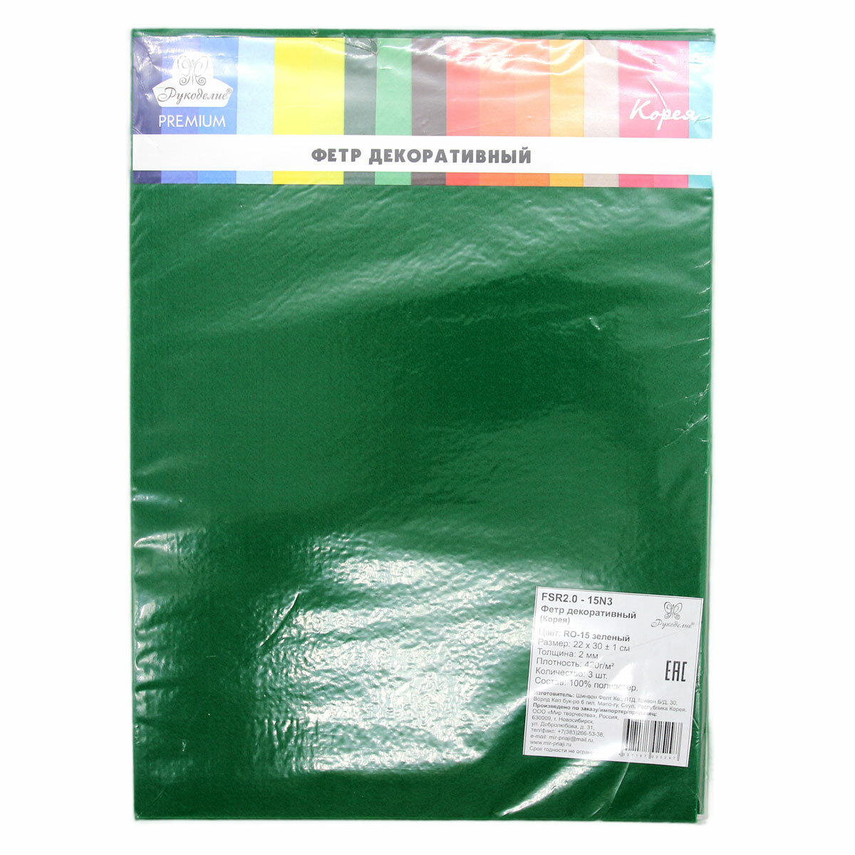 Набор декоративного фетра 22*30 см, толщина 2 мм, 3 листа в упаковке (15 зеленый) информация: