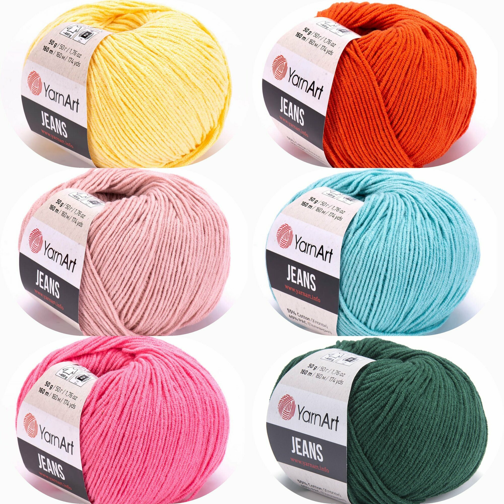 Пряжа YarnArt Jeans Ярнарт джинс Набор для вязания 22 (03, 15, 23, 47, 51, 52) 6 мотков 50 г/160 м (45% акрил, 55% хлопок) 916 ₽