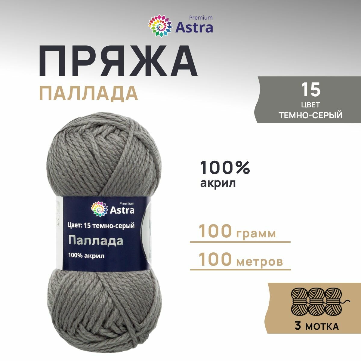 Пряжа для вязания Astra Premium 'Паллада' 100г, 100м (100% акрил) (15 темно-серый), 3 мотка информация: