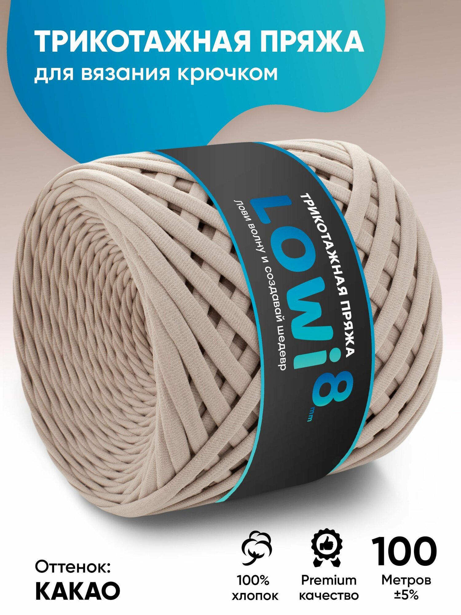 Трикотажная пряжа лента для вязания Lowi 100% хлопок, 8мм/100м, цвет Какао информация: