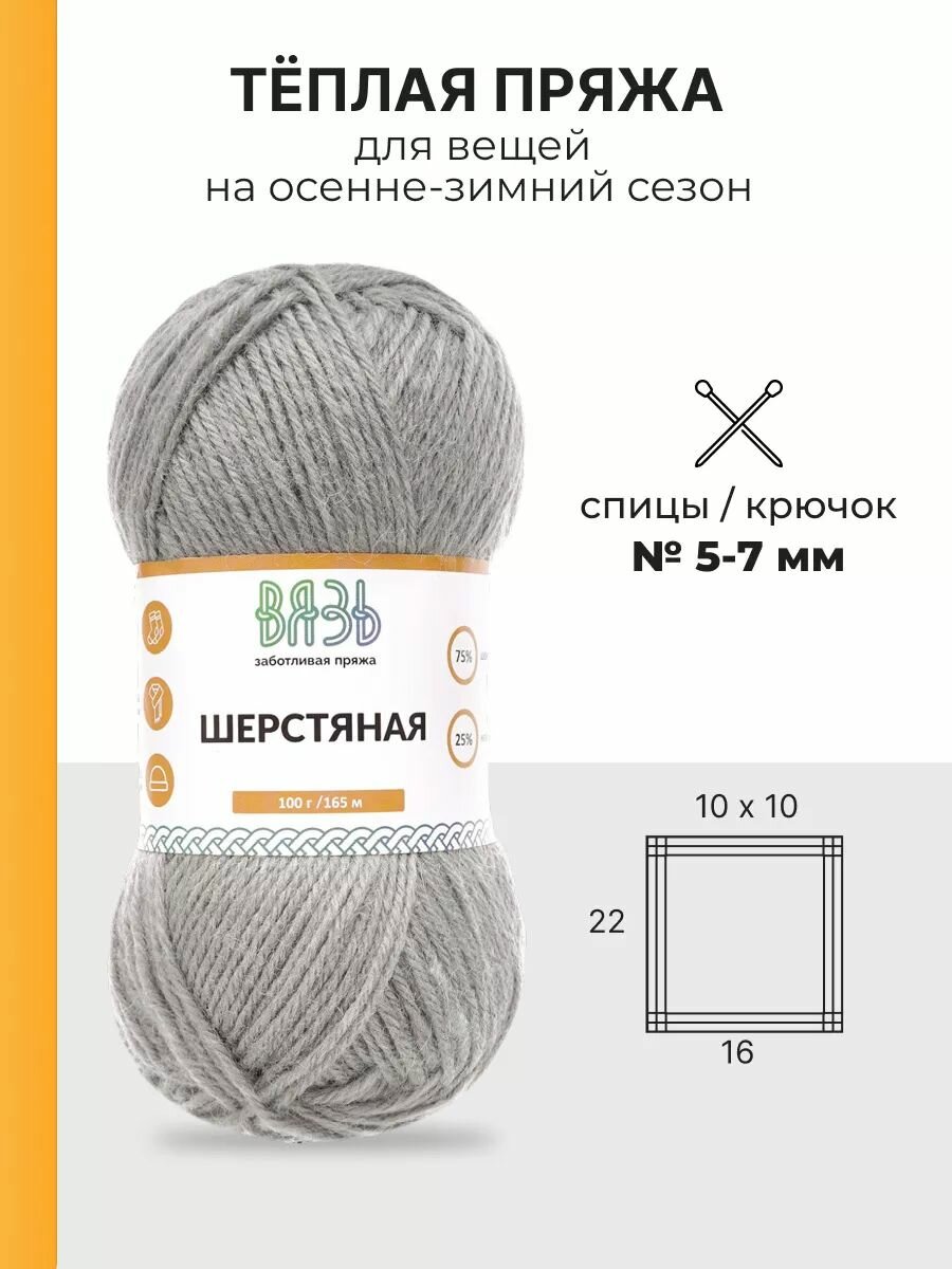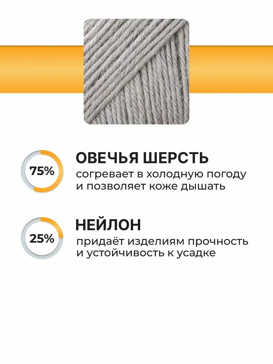 Пряжа для вязания Вязь 'Шерстяная' 100г, 165м (75% шерсть, 25% нейлон) (13 светло-серый), 3 мотка информация: