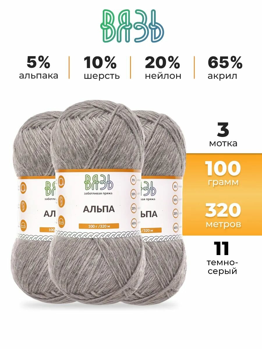 10 цен на Пряжа для вязания Вязь 'Альпа' 100г, 320м (5% альпака, 10% шерсть, 20% нейлон, 65% акрил) (11 темно-серый), 3 мотка