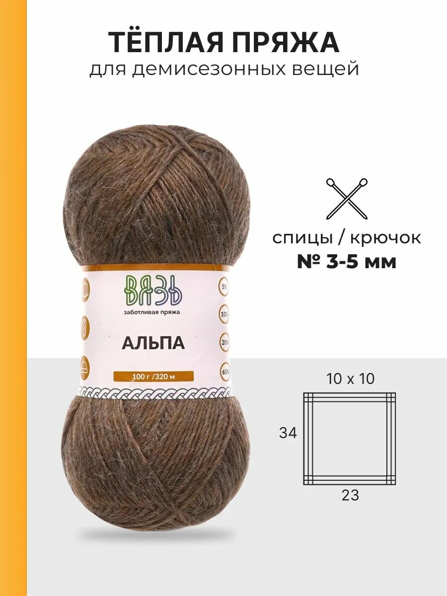 10 цен на Пряжа для вязания Вязь 'Альпа' 100г, 320м (5% альпака, 10% шерсть, 20% нейлон, 65% акрил) (13 коричневый), 3 мотка