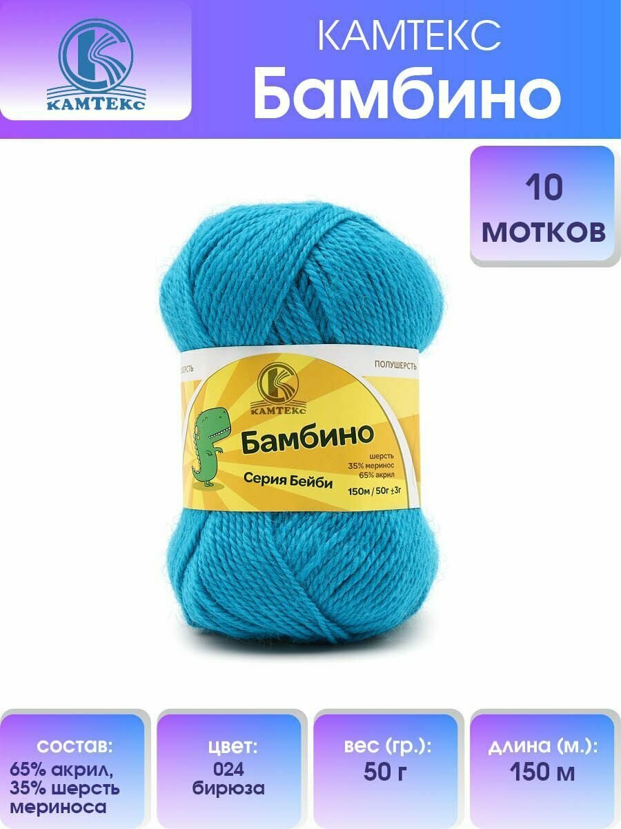 10 цен на Пряжа для вязания Камтекс 'Бамбино' 50г, 150м (35% шерсть меринос, 65% акрил) (024 бирюза), 10 мотков