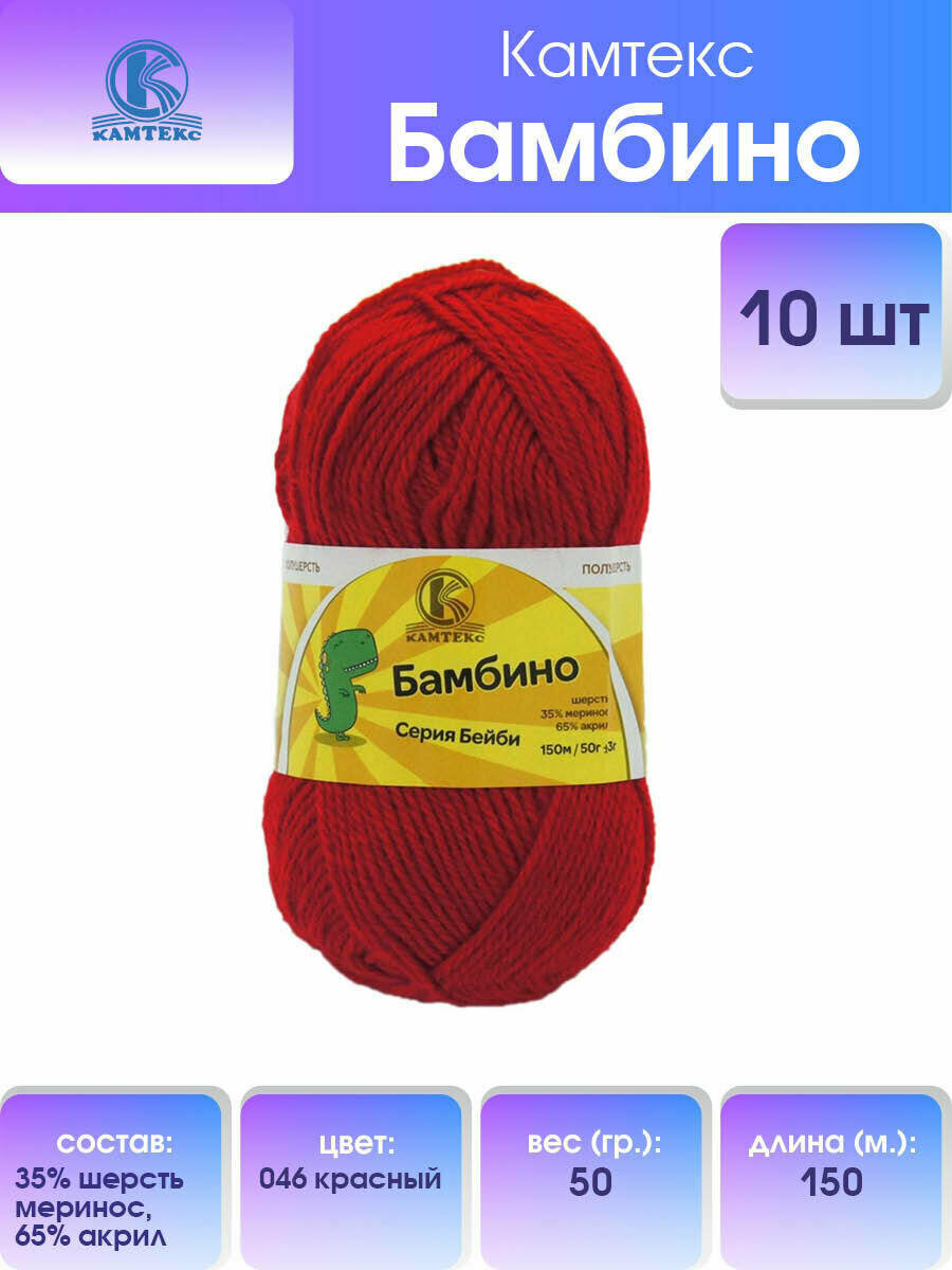 Пряжа для вязания Камтекс 'Бамбино' 50г, 150м (35% шерсть меринос, 65% акрил) (046 красный), 10 мотков информация: