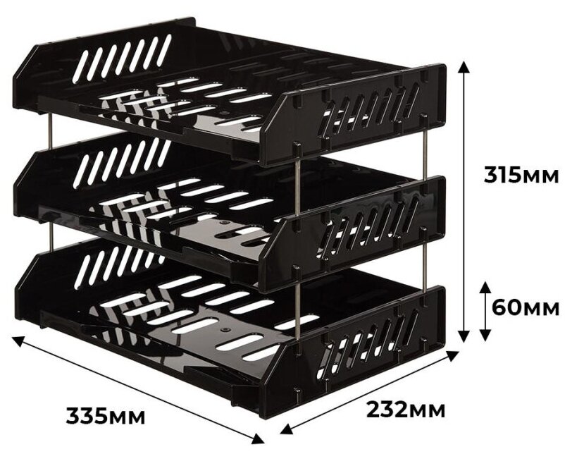 Лотки горизонтальные для бумаг, набор 3 шт. (335х232х280 мм), на металлических стержнях 60 мм, черные, "Сити", ЛТ560 информация: