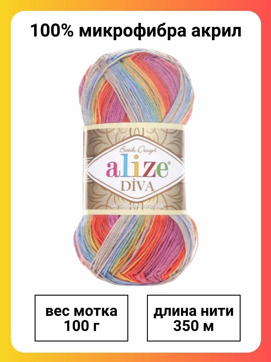 Пряжа для вязания крючком, спицами Alize Ализе Diva batik design, тонкая, микрофибра 100%, цвет 1815, мультиколор, 5 шт. по 100 г, 350 м