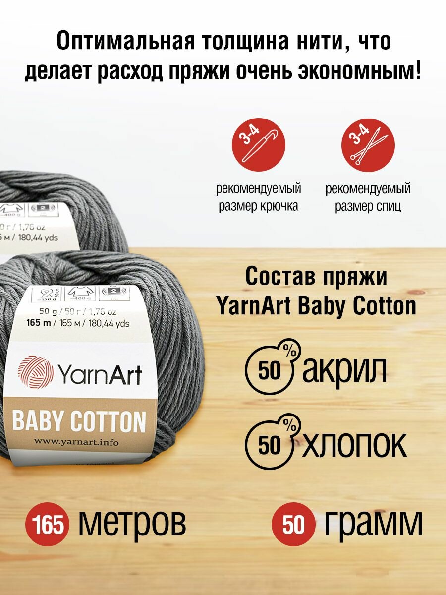 Пряжа для вязания YarnArt 'Baby Cotton' 50г, 165м (50% хлопок, 50% акрил) (406 светло-серый), 10 мотков 1 155 ₽