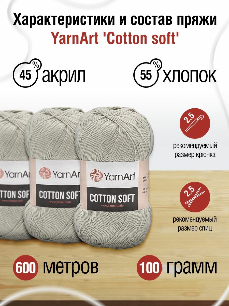 Пряжа для вязания YarnArt 'Cotton soft' 100г, 600м (55% хлопок, 45% акрил) (49), 5 мотков информация: