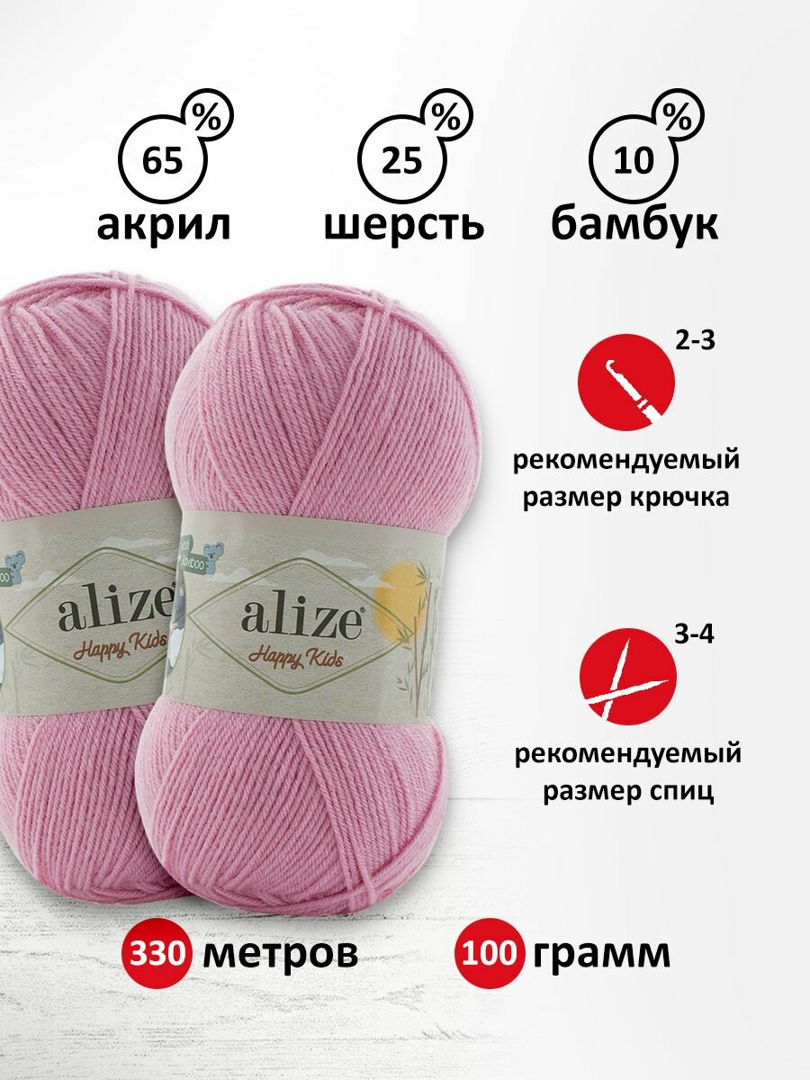 Пряжа HAPPY KIDS ALIZE, розовый - 726, 25% шерсть, 10% бамбук, 65% акрил, 5 мотков, 100 г, 310 м. 1 389 ₽
