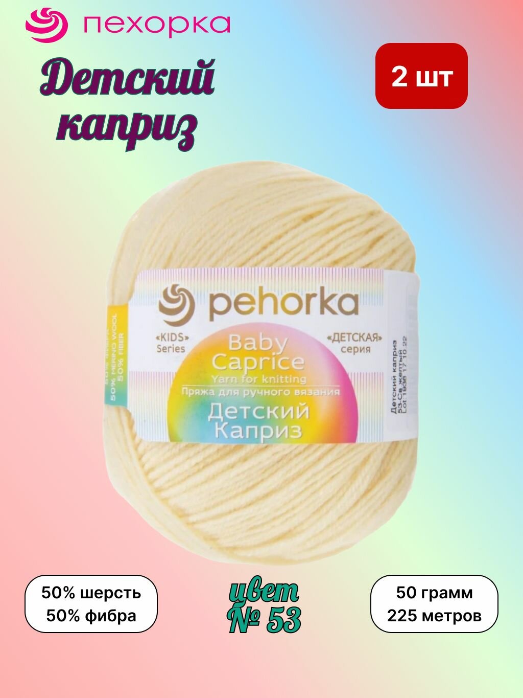 Пряжа Пехорка Детский каприз Светло-желтый (53) 2 мотка 50 г / 225 м (50% шерсть 50% фибра) информация: