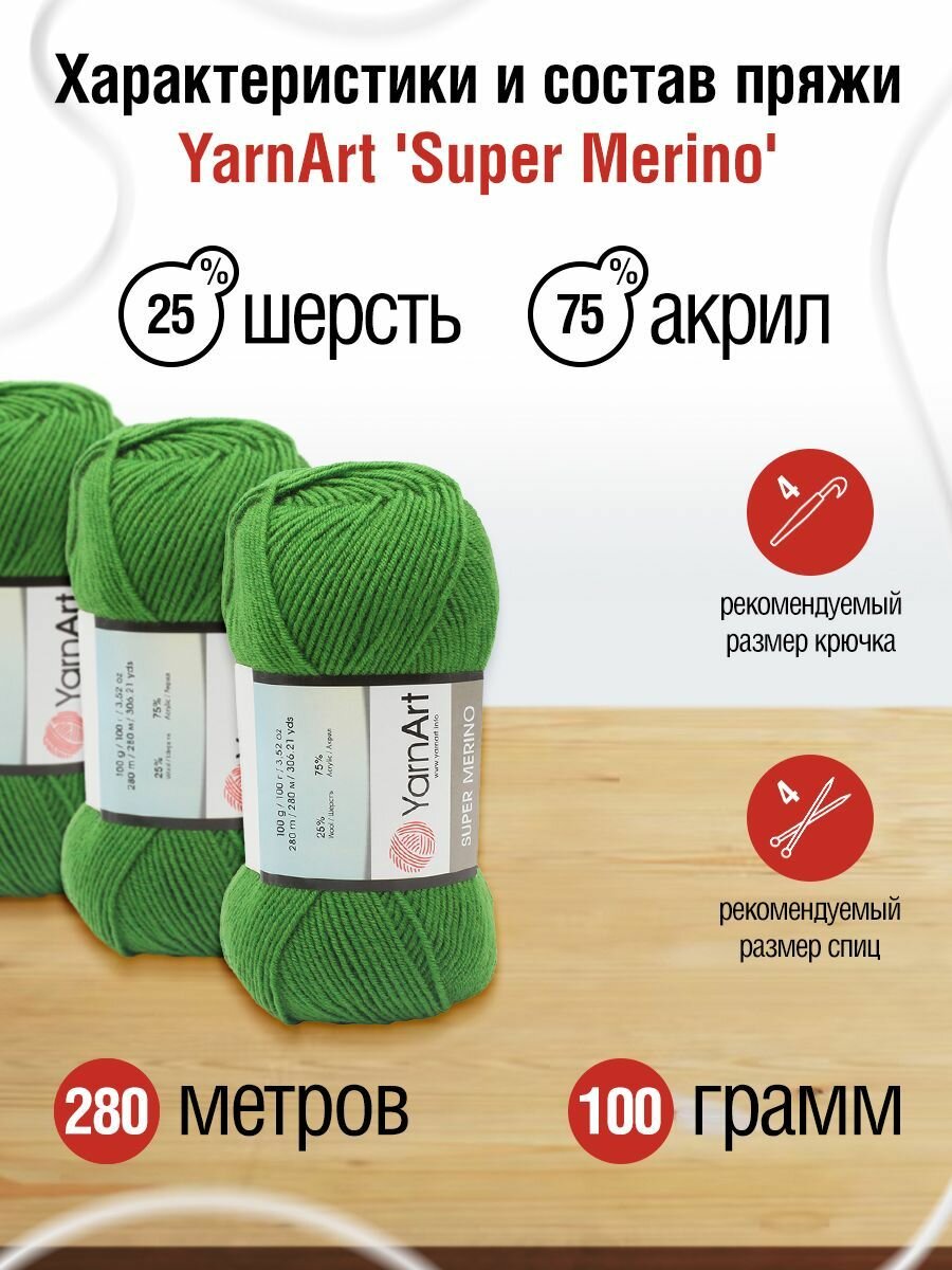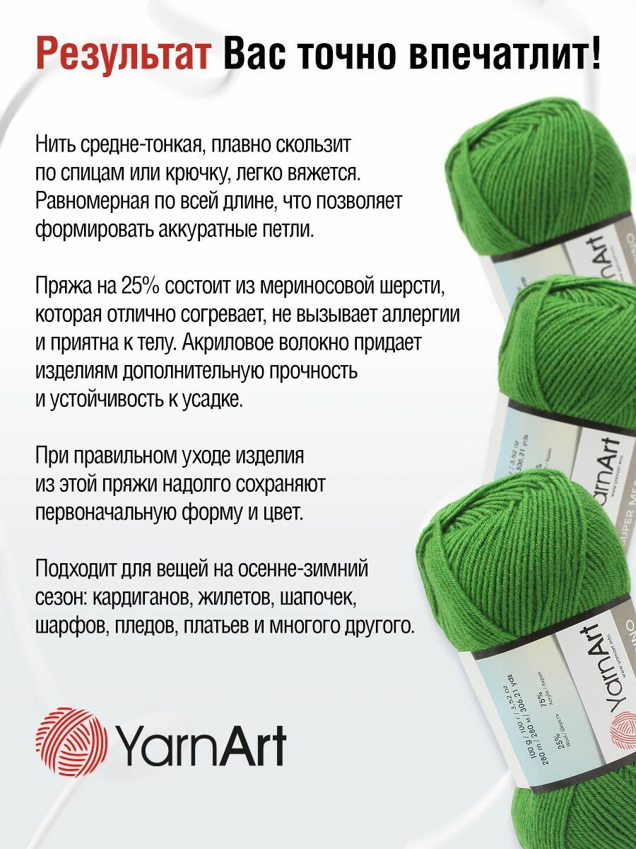 Отзывы на Пряжа YarnArt 'Super Merino' 100г, 280м (25% шерсть, 75% акрил) (6574 зелёный), 5 мотков