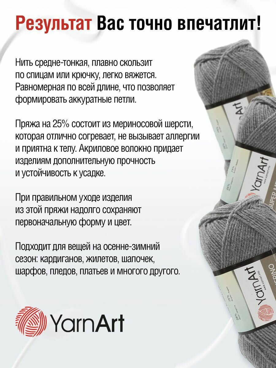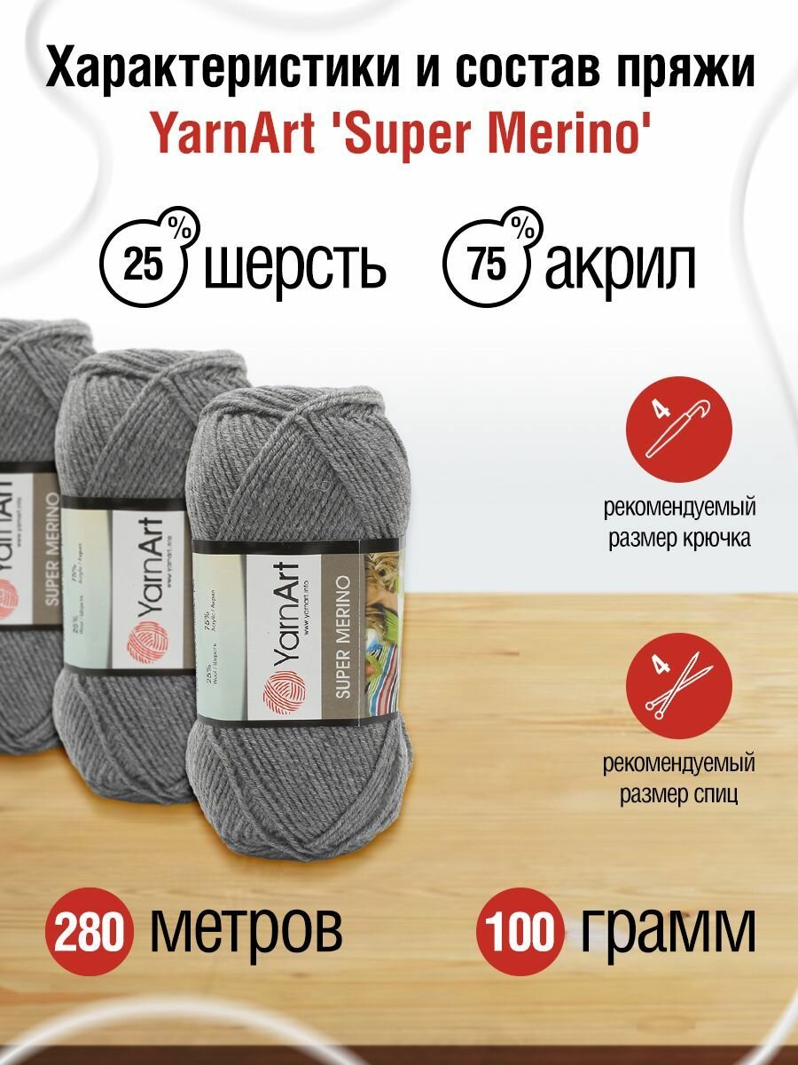 Пряжа YarnArt 'Super Merino' 100г, 280м (25% шерсть, 75% акрил) (194 серый меланж), 5 мотков информация: