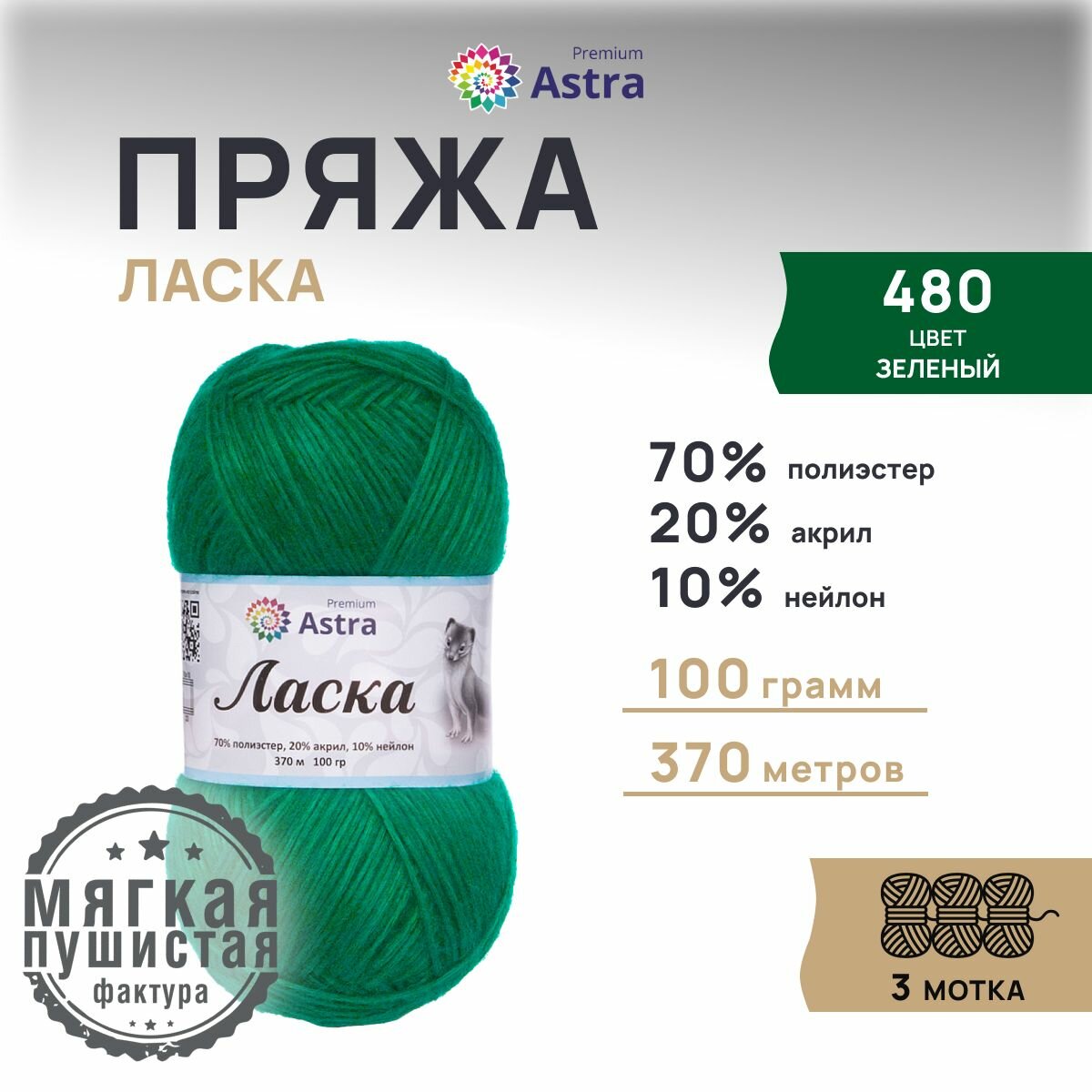 Пряжа для вязания Astra Premium 'Ласка' 100г, 370м (70% полиэстер, 20% акрил, 10% нейлон) (480 зеленый), 3 мотка информация: