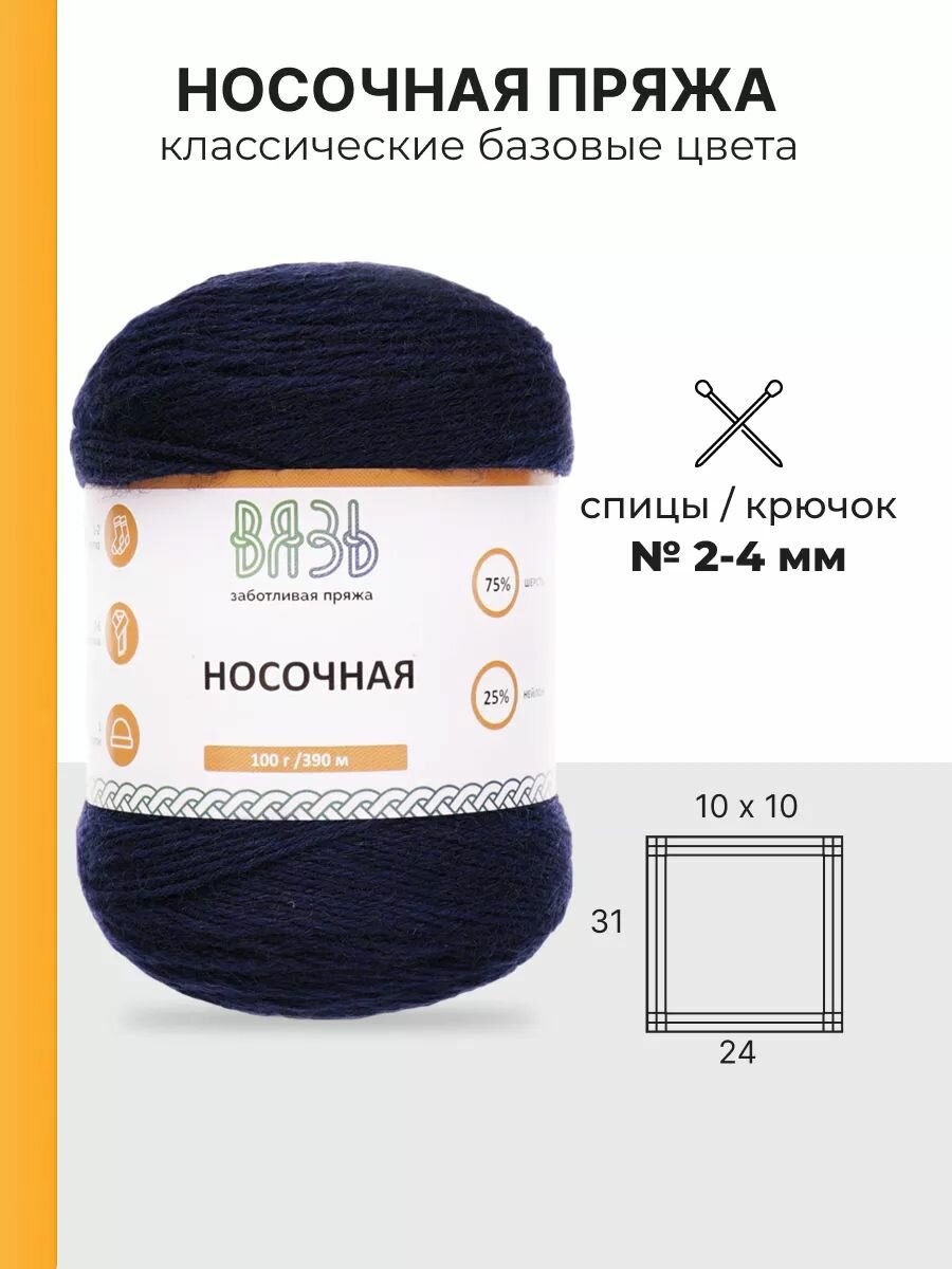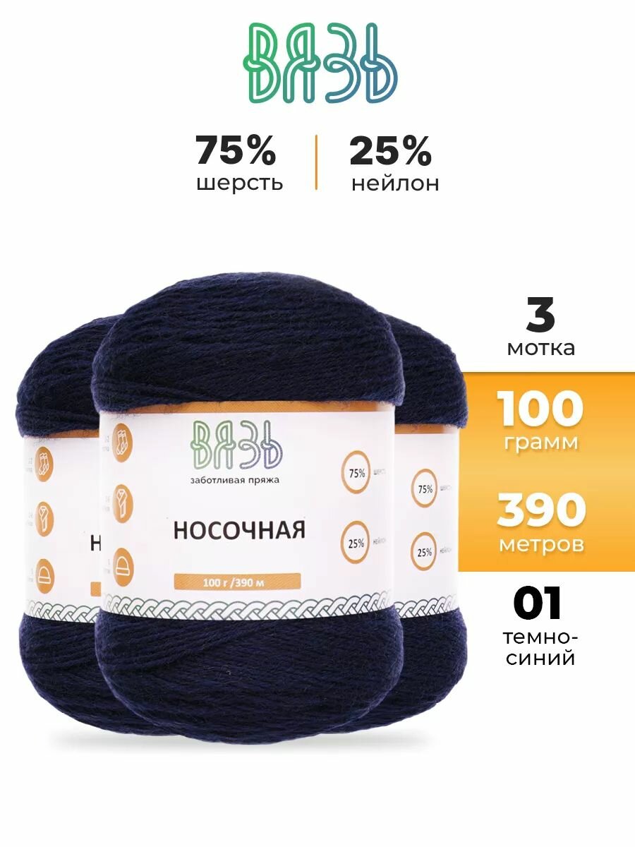 10 цен на Пряжа для вязания Вязь 'Носочная' 100г, 390м (75% шерсть, 25% нейлон) (01 темно-синий), 3 мотка