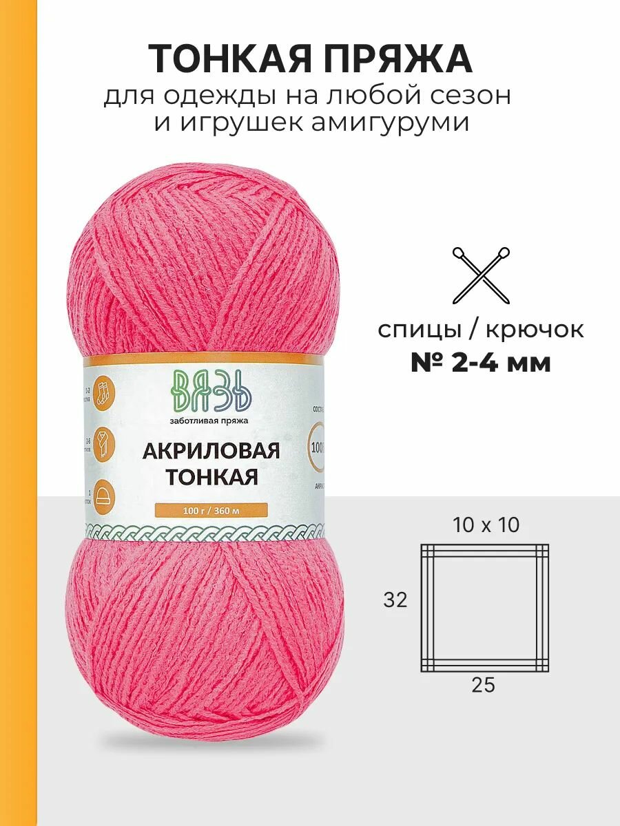 Пряжа для вязания Вязь 'Акриловая тонкая' 100г, 360м (100% акрил) (123 розовый), 3 мотка информация: