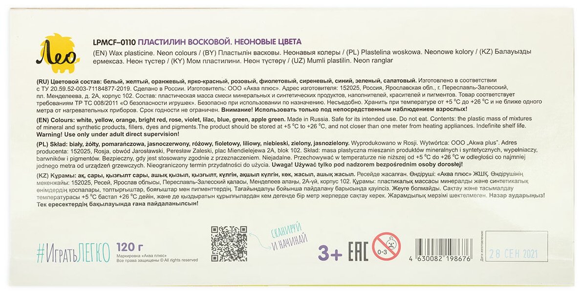 Пластилин восковой "Лео" "Играй" Неоновые цвета LPMCF-0110 120 г 10 цв. информация:
