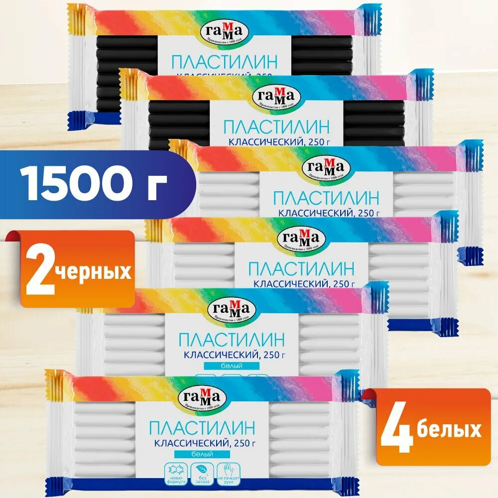 Пластилин Гамма "Классический", 6 шт (4 белых+2 черных цвета), 1500г, картон. упаковка информация: