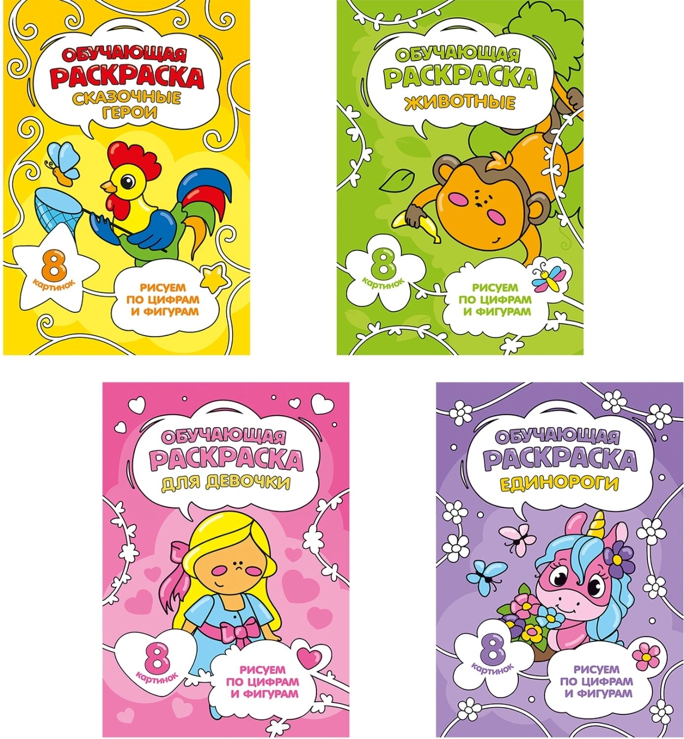Раскраска обучающие по цифрам и фигурам 4шт/уп. Для девочек информация: