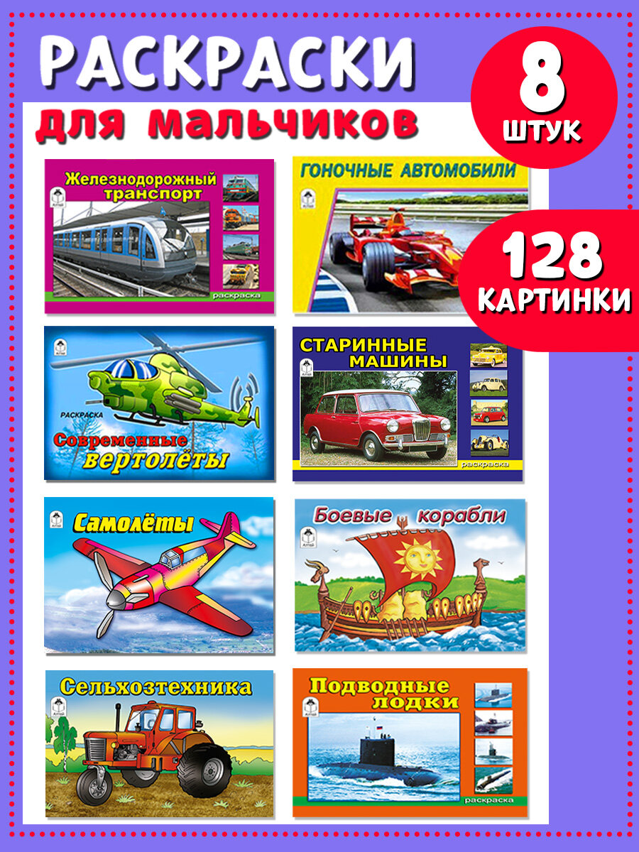 10 цен на Раскраска для мальчиков "Машины и Техника", 8 штук, от 2 лет, 128 стр